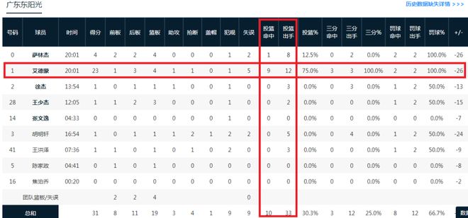 广东上半场除萨姆纳12中9得到23分外,其余球员合计21中1,且其余球员前20中0。