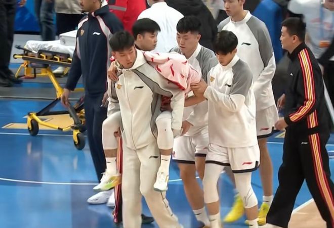 次节中段周琦被萨姆纳撞倒,周琦倒地后连带撞到徐杰膝盖,徐杰受伤被队友背出场。
