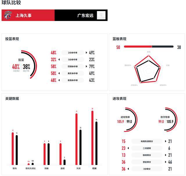 广东队此役状态并不好,投篮命中率只有38%,远低于对手的40%,篮板球更是被完爆,38-50。球队核心杨溢尽管上半场手感不佳,但下半场爆发,全场32投11中,三分球10投4中,12罚11中,砍下37分10篮板4助攻、赵昱锟15分5篮板3助攻,张家睿12分7篮板,赵保乐13分5篮板。