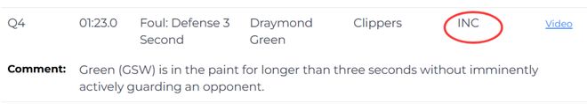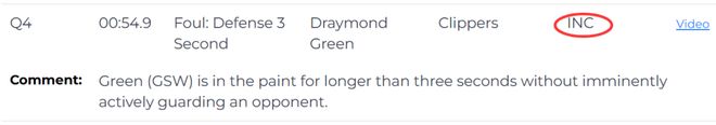 第三次漏判发生在距离比赛结束还有54.9秒,同样是勇士队的格林在没有积极防守对方球员的情况下,在己方禁区停留时间超过三秒,这也是一次漏吹的防守三秒违例,勇士获利,快船吃亏。