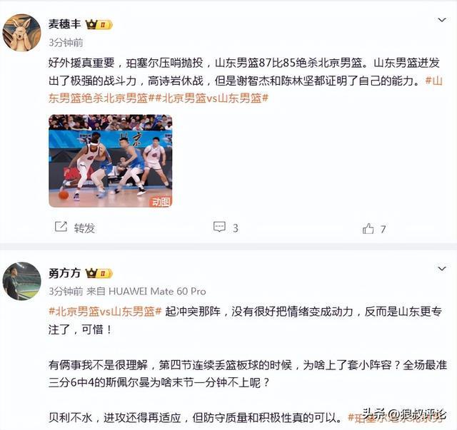 篮球记者“贾磊”发文点评:“珀塞尔绝杀了!山东队今天确实是打的更出色的那支球队,谢智杰很好的展现了自己打一号位的能力,将山东队的进攻梳理的井井有条。两支球队其实在最后时刻都犯了错误,但很显然北京队犯了更多的错误。如果说有什么疑问,就是不知道斯皮尔曼这场前面状态那么好,第四节为什么就不用了?斯皮尔曼前三节可是12中8拿了20分啊。”