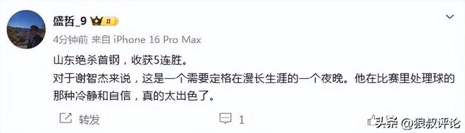 媒体人“盛哲”发文点评:山东绝杀首钢,收获5连胜。