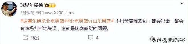 媒体人“球界年糕杨”发文点评:不用苛责陈盈骏,都会犯错,都会有临场判断地失误,这就是比赛感觉的问题。
