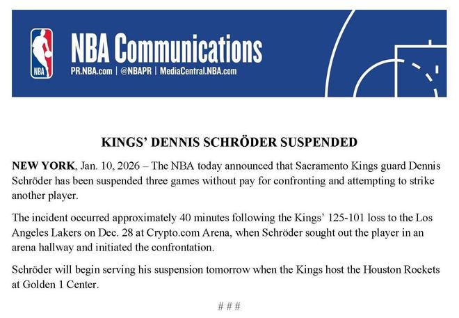 官方公告显示,施罗德在12月29日国王和湖人的比赛结束约40分钟后,在湖人主场球馆的走廊主动找到一名湖人球员并发生了冲突。