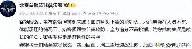 赛后,北京男篮官方社媒发文:客场鏖战,虽有遗憾但拼劲未减!面对势头正盛的深圳队,北汽男篮在人员不整、体能承压的情况下,始终紧跟快节奏攻防,全力追分不曾松懈。防守端的失误是成长的注脚,密集赛程更是对韧性的考验~