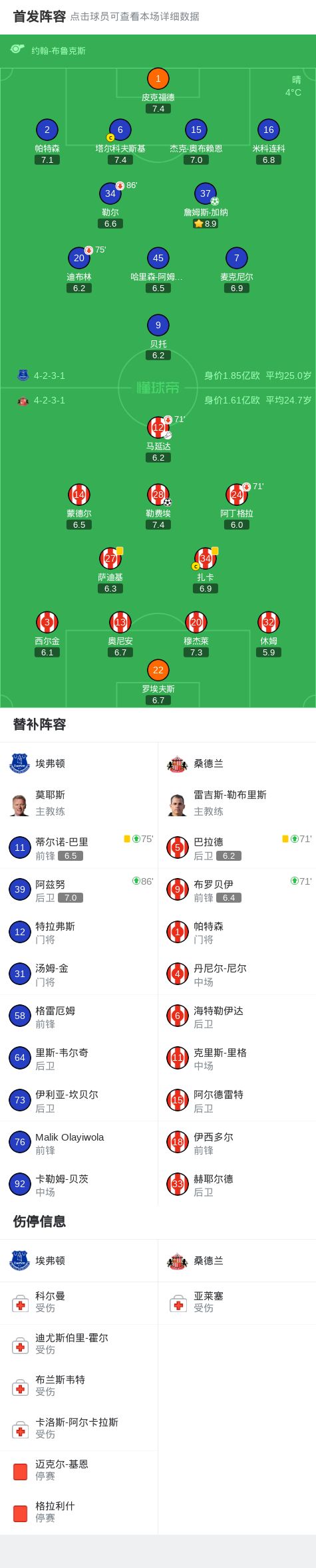 - 90分钟战报:埃弗顿1-1桑德兰,詹姆斯-加纳点射绝平