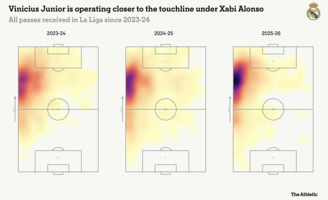 但在阿隆索麾下,他的职责逐渐变成了在左路保持位置,并由边后卫或中场在肋部提供支持。下方展示的维尼修斯接球区域图,正体现了这一点。