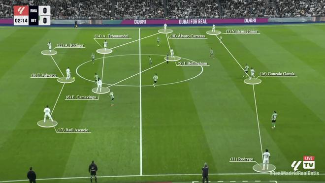 他们的阵型往往呈现出下图所示的样子(对阵贝蒂斯的比赛),目的是通过站位拉扯制造对手防线的空隙,再利用后插上跑动进行打击。为了让这一计划奏效,维尼修斯必须始终待在边路,吸引一到两名防守球员。